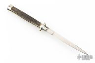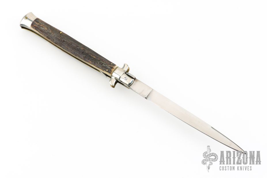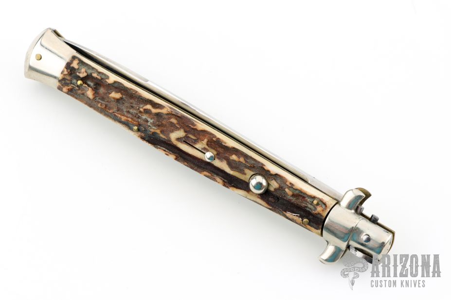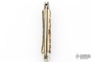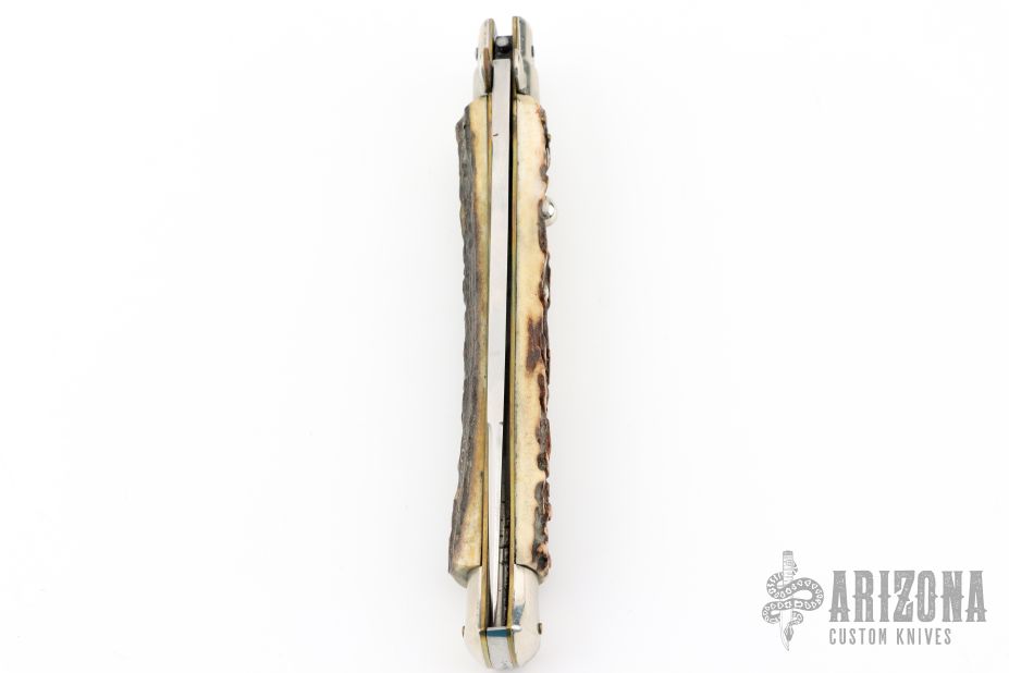 This 13" Swivel Bolster features a polished ground blade with false top edge. The handle has stainless steel bolsters, front and rear, stag scales, brass liners, stainless spring. Has some light scratches, otherwise excellent condition.