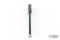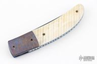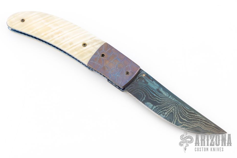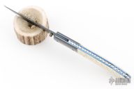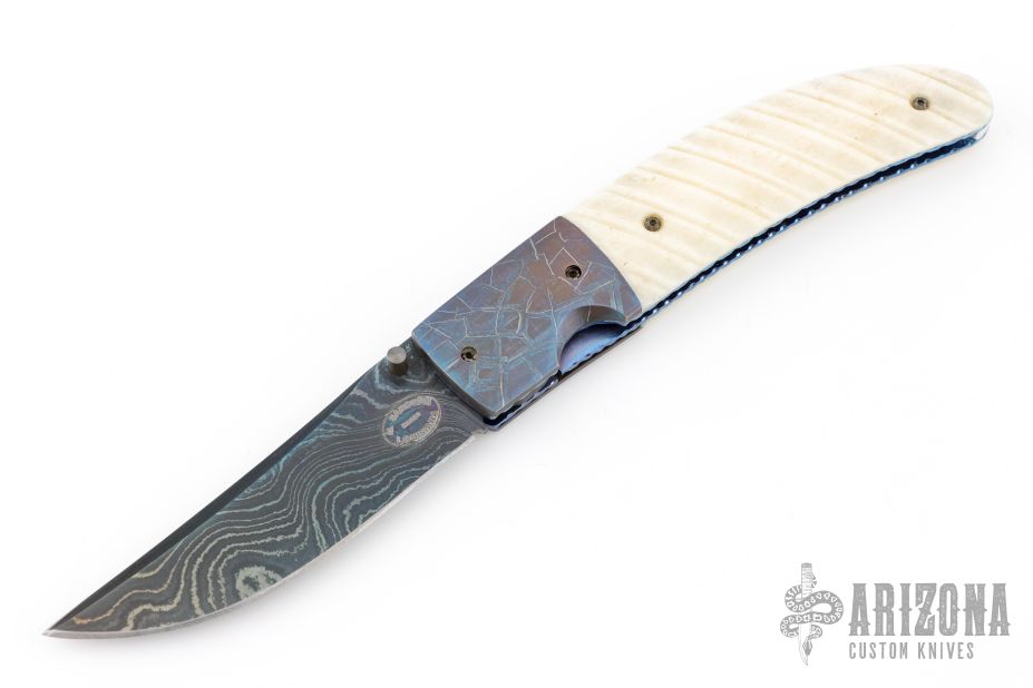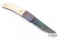 This linerlock folder by Mike Sanders features a Damascus blade with a single thumbstud. The handle has dovetailed Damascus bolsters, fluted bone scales, fileworked and anodized titanium liners and a fileworked aluminum backspacer. Excellent condition.  #1213