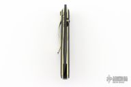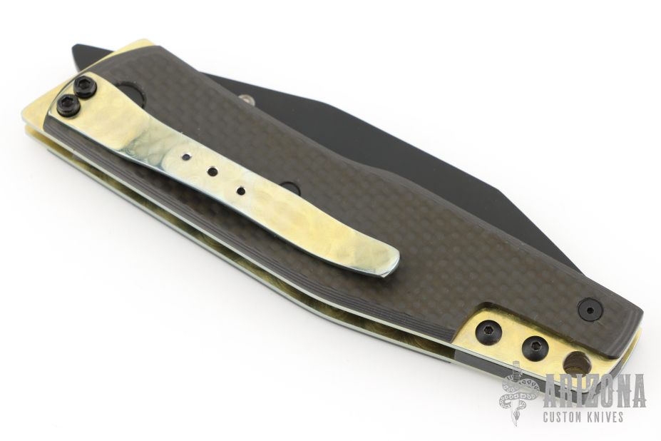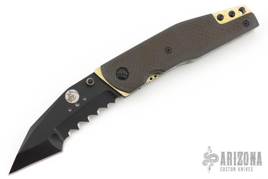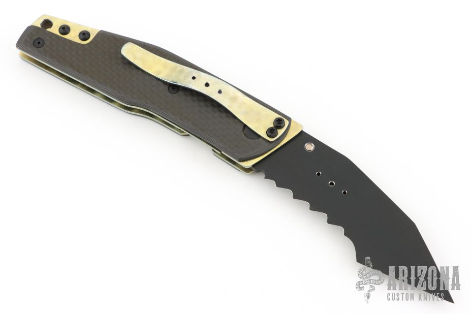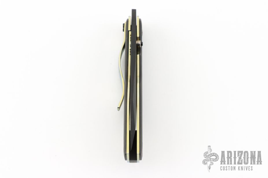This liner lock folder from Mike Franklin features a chisel ground black blade with serrations and a single thumbstud.  Handle has an anodized and jeweled titanium frame with carbon fiber scales. Tip down, jeweled titanium clip, black stainless steel backspacer. Nice lockup and blade seating. Excellent condition.