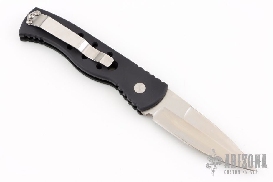 This is a TR-2 side opening auto by Pro-Tech Knives with a spear point satin blade. It has a black aluminum handle with holes. Mirror/tumble finished stainless steel clip. Coil spring. Comes with original box and papers. Has a couple light scuffs, excellent condition otherwise. Fires hard!