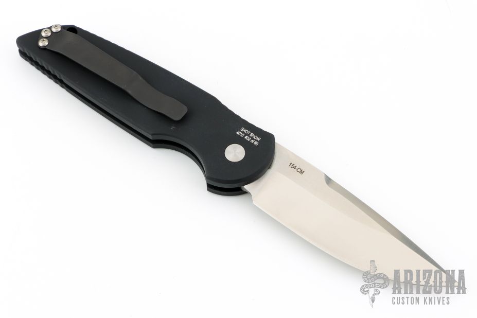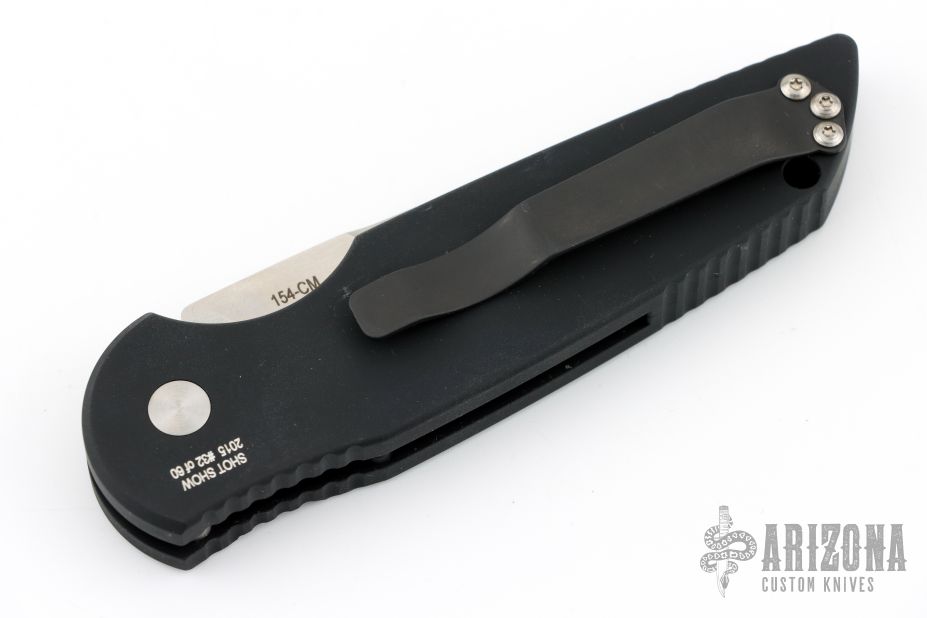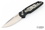 The TR-3 is one of Pro-Tech's most popular knives with law enforcement professionals and military. The TR-3 offers a multi-task 3.5" blade in a very slender thoughtfully designed handle. This 2015 Shot Show Edition TR-3 has a satin finish blade with a plain edge, and a black aluminum handle with Shaw designed "coin struck" skull and bones inlay on front. Black stainless steel clip. Steel push button. #32of60. Has a couple light scuffs, excellent condition otherwise.