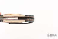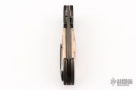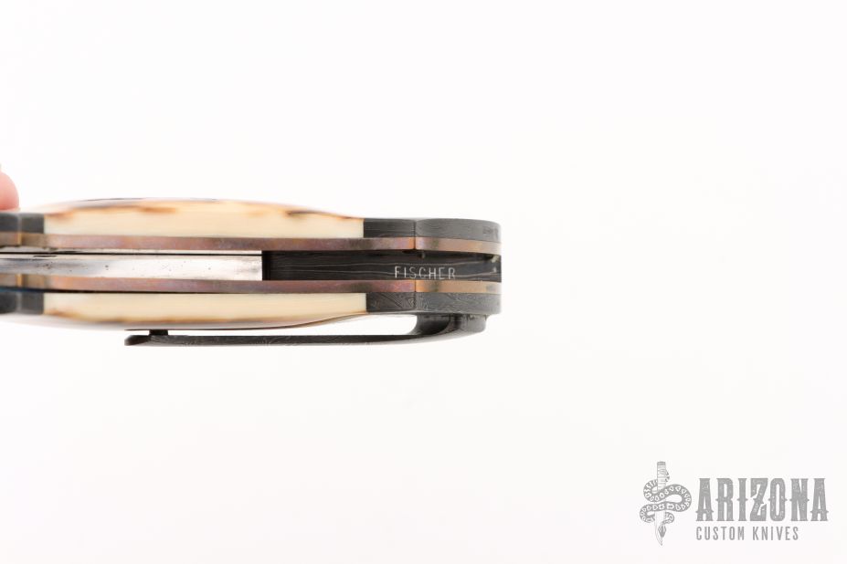 This Hawkbill Linerlock folder by Todd Fischer Sr features a Damascus blade with fileworked spine and a single thumbstud with mammoth ivory inlay. The handle has Damascus bolsters, mammoth ivory scales, anodized titanium liners with jeweled interiors, and a fileworked Damascus backspacer and tip up clip with hidden screws. Smooth action. Nice blade seating, detent, and lockup. Excellent condition. There is no visible hardware on this knife, pretty impressive! Comes with a zippered case.
