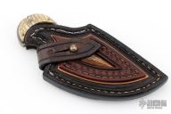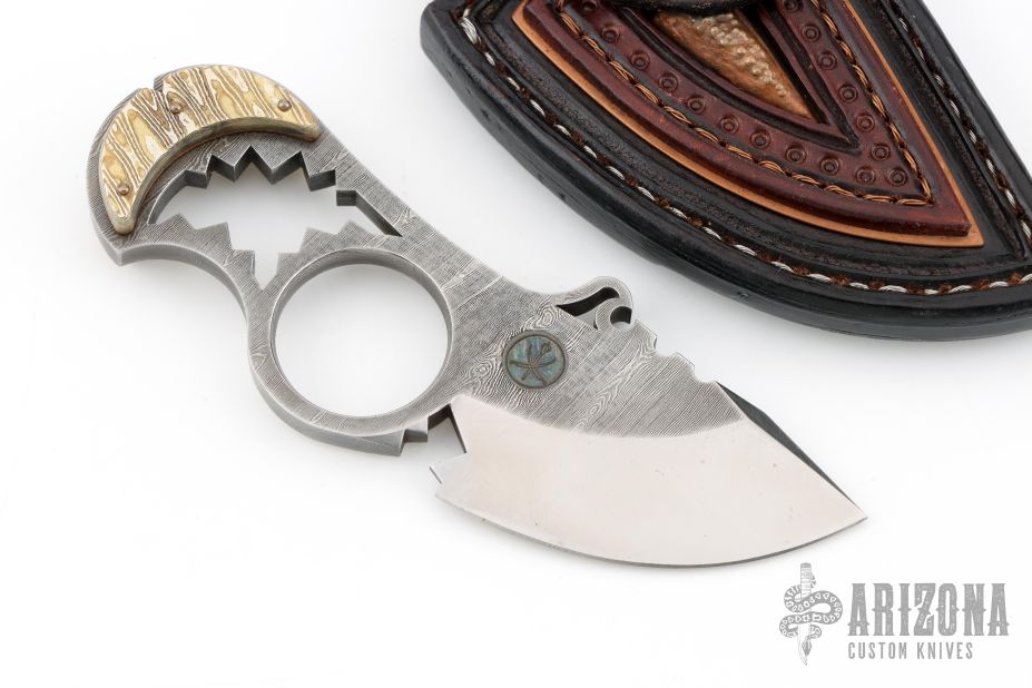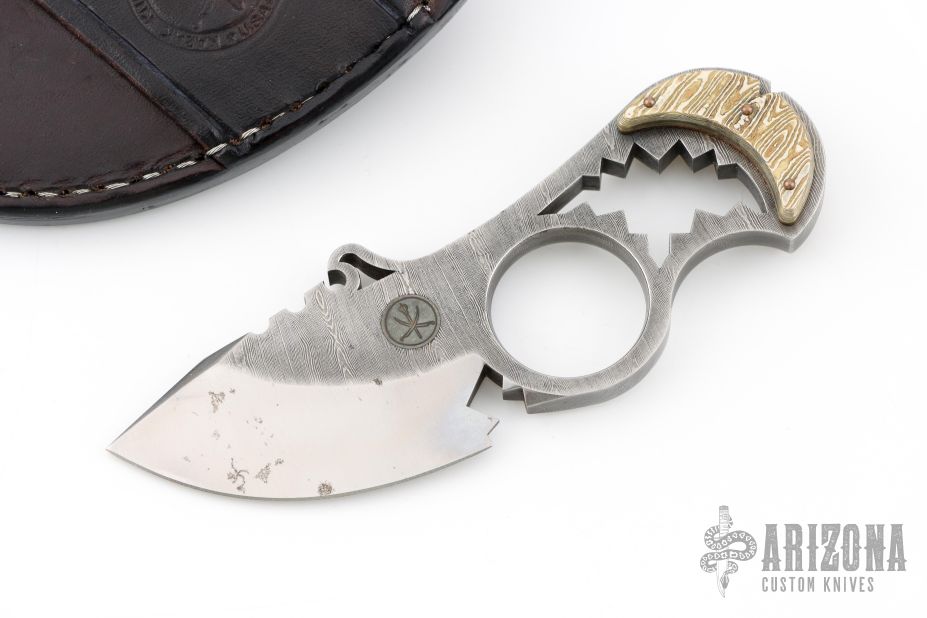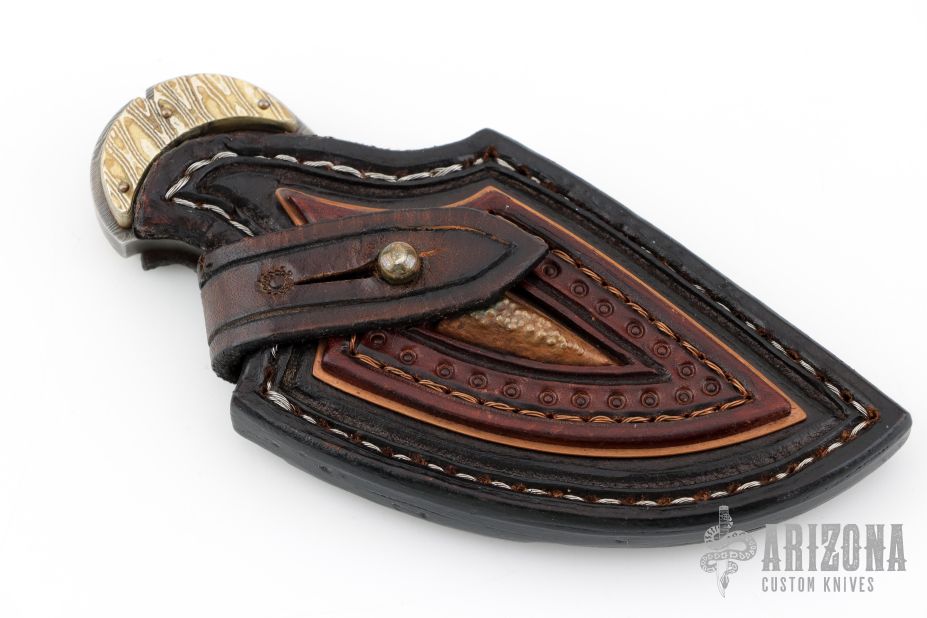 The Piranha from the Fight Club Series Collection by Kazak Knives features a Damascus blade and mokume scales with copper liners, .220" blade thickness and 1.576" blade depth, full tang construction. Comes with a hand tooled brown leather sheath with copper accents. Has some oxidation on the blade, otherwise excellent condition.