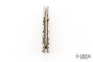 This linerlock by Jim Elliot features a hand rub satin finished blade with a fileworked spine and a single thumbstud black stone inlay. The handle has dovetailed stainless steel bolsters, crosscut mammoth ivory scales, fileworked and anodized titanium liners with jeweled interiors, fileworked stainless steel backspacer. Nice lockup and blade seating. Excellent condition.