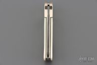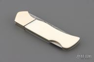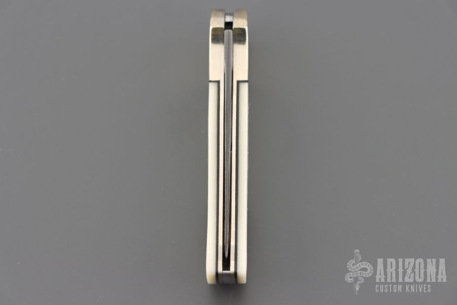 This lockback by Boker features a Damascus blade. The handle has nickel silver bolsters, white G-10 scales with black liners, nickel silver liners, stainless steel backspacer. #045 on the backspacer. Has a few light scratches, otherwise excellent condition.