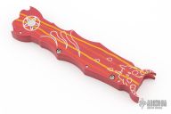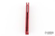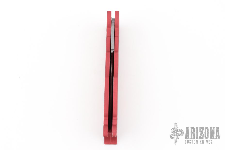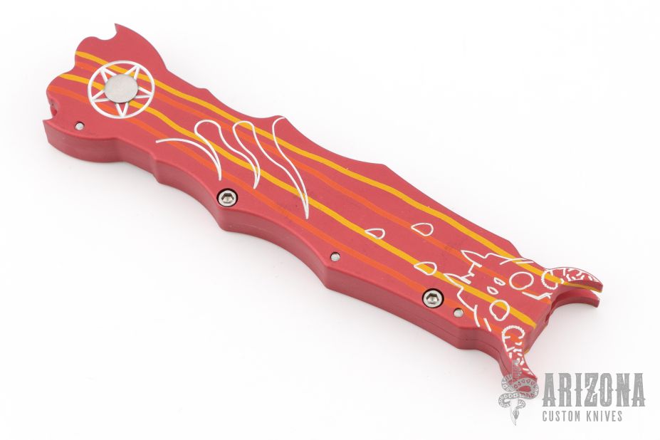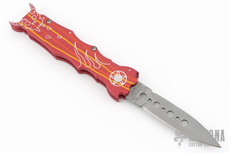 This side opening automatic from Rob Dalton features a bead blast finished double edged blade and aluminum frame with devil motif. Excellent condition.