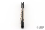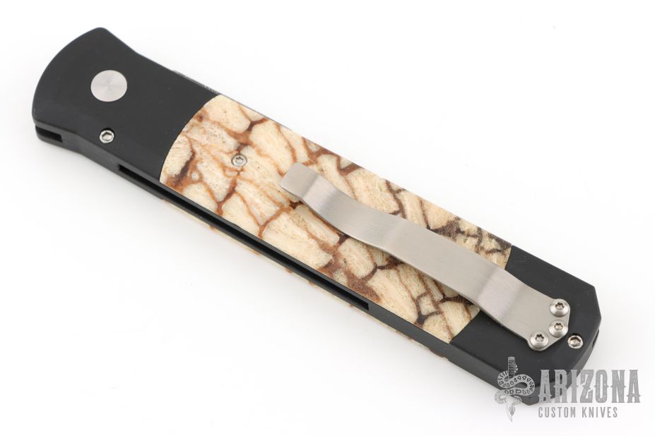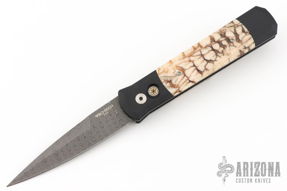 This Godfather by Pro-Tech features a Damascus blade with false top edge. The handle has tiger coral inlays in the black aluminum handle with tip up stainless clip. Excellent condition.