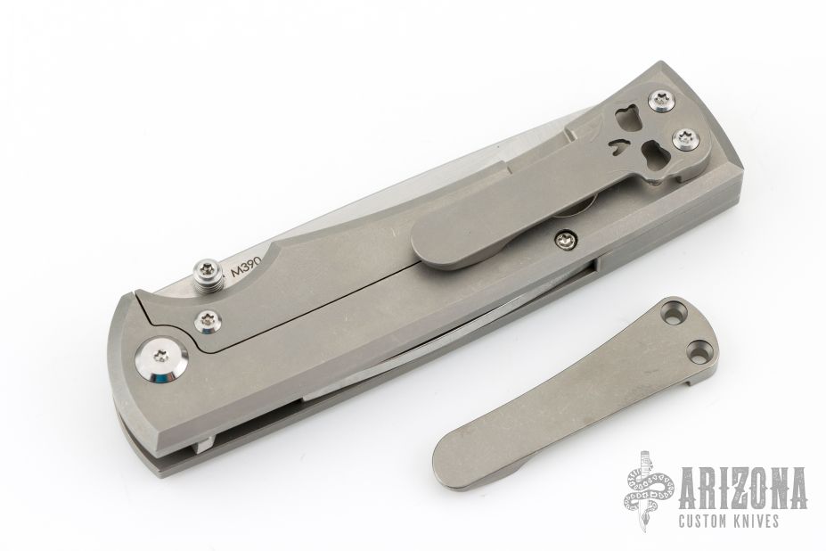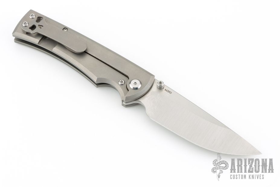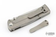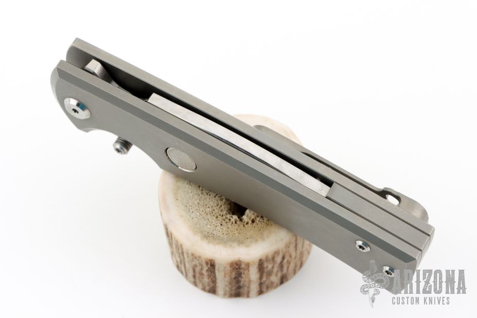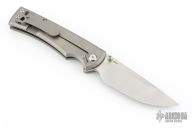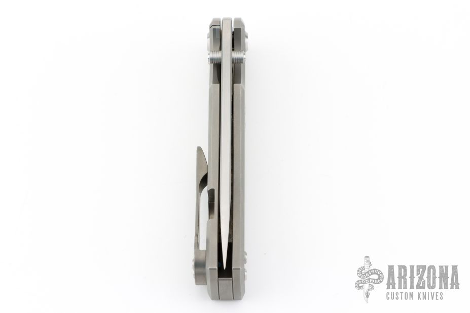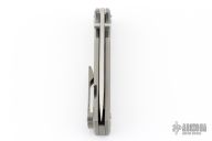 This Chaves Ultramar Liberation has been professionally converted to a side-opening automatic by Kyle Vallotton. It features a satin finished blade with the Chaves logo, a tumbled titanium frame with skull pocket clip positioned for tip-up carry, and a matching titanium backspacer. Additional details include jeweled steel backspring. The knife comes with its original box and a spare titanium pocket clip, and is offered new from the maker.
