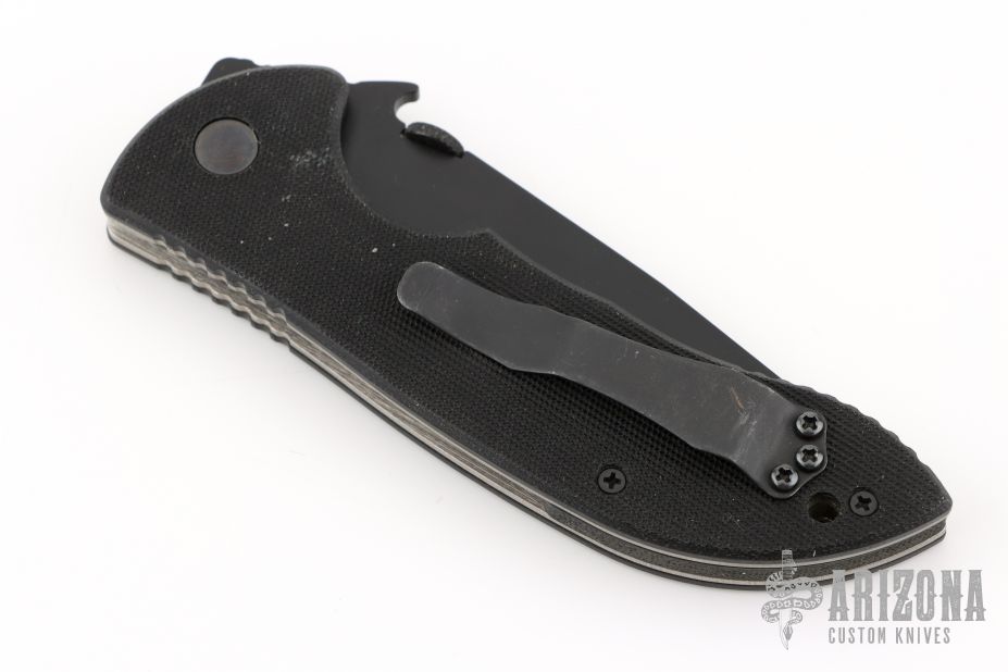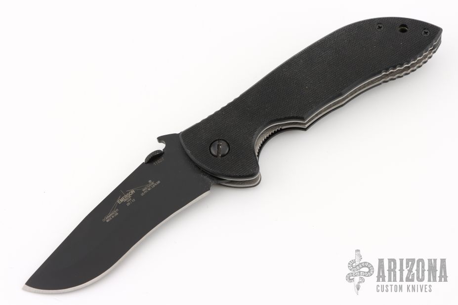 'The Emerson Commander is a 21st century combination of design, materials, performance, and razor sharpness. This knife along with other Emerson Knives, sets the new standard for the cutlery industry and continues to push the design and performance envelope for cutting tools well into the 21st century.' 'The Commander knife-battle tested and proven-incorporates some of the most advanced ergonomics ever featured on a folding knife. The knife, already in use with elite armed forces, European Military strike teams and NATO Counter-Terrorist units throughout the world was chosen by the U.S. Navy SEAL teams for issue to special units within the Naval Special Forces Units. Because of its ruggedness, it has become a favorite of hunters, outdoorsman and adventurers the world over. It features the patented 'wave shaped opening feature.' This production Commander linerlock folder has a black blade and black G10 handle. Wave feature. Excellent condition. #11827 and dated 2012
