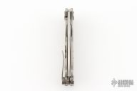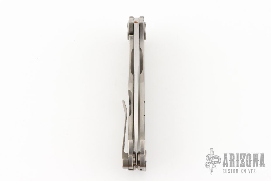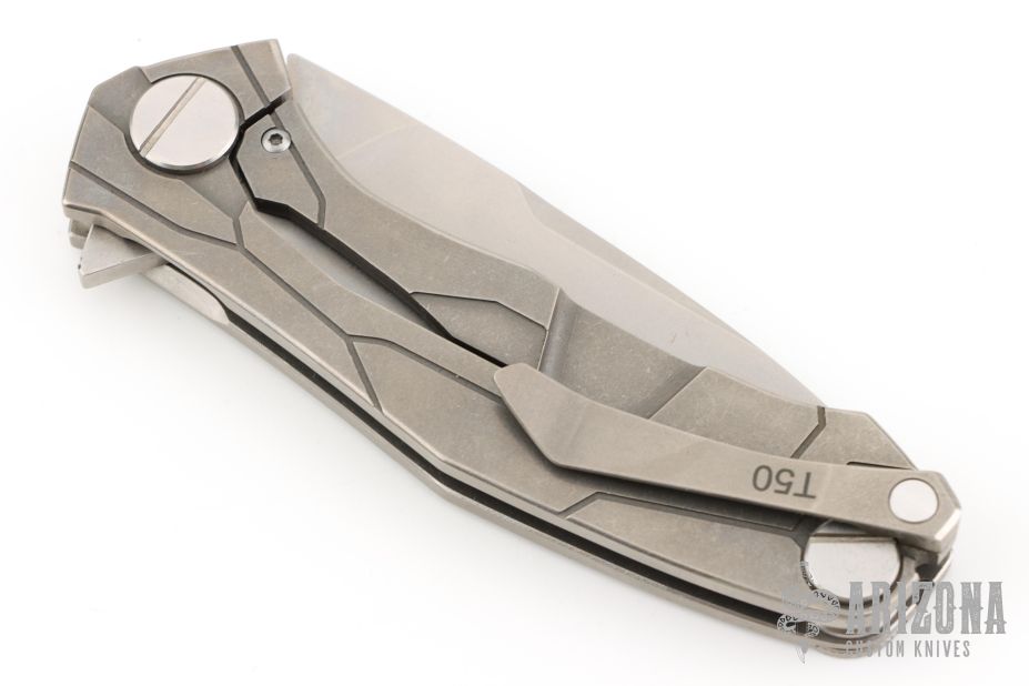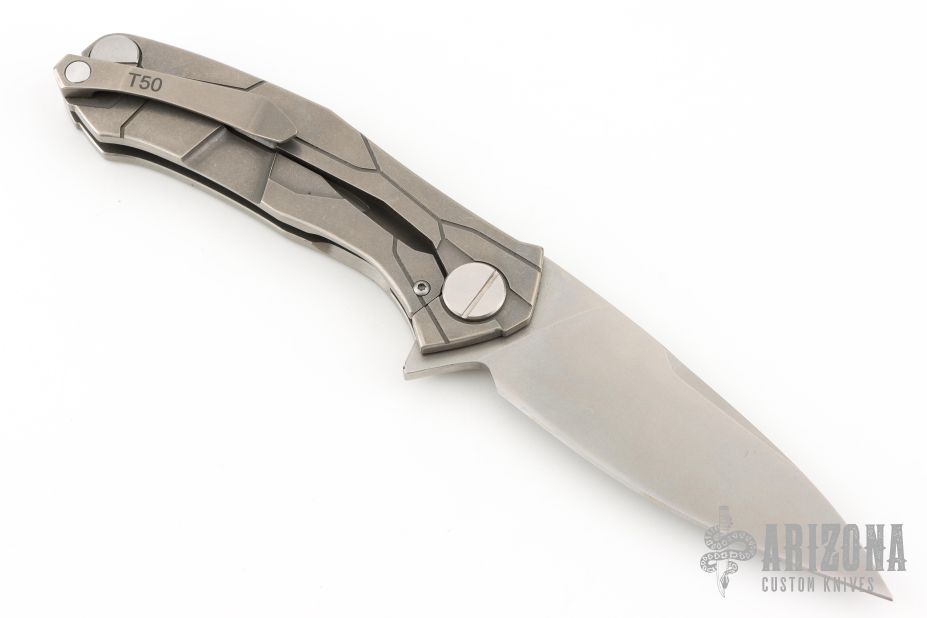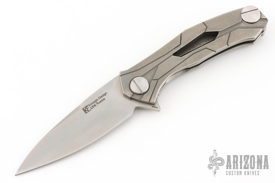 The Prototype T50 by Custom Knife Factory is an Alexey Konygin design that features a stonewashed blade with flipper. The handle has a milled and stonewashed titanium frame and tip up clip. Marked Prototype inside the frame. Rides on bearings, nice detent, lockup and blade seating. Has some scratches, otherwise good condition. Comes with a zippered case and COA dated 05/14