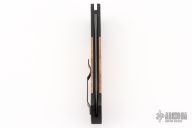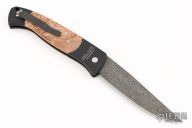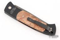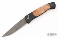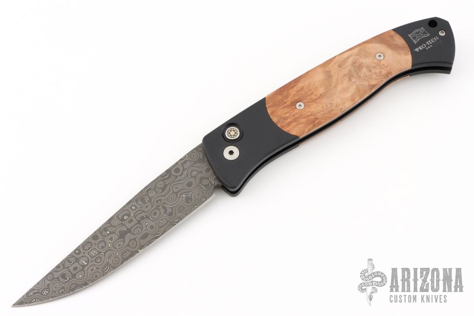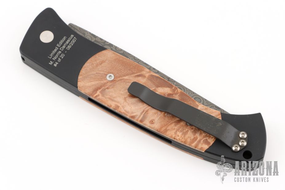 The Walter Brend designed/Pro-Tech collaboration - Brend Auto #1. It features a Mike Norris Stainless "Sun Storm" Damascus blade with false top edge. The handle is comprised of black anodized aluminum double bolsters and maple burl inlays over a black anodized frame. Black coated, tip down steel clip and lanyard hole in pommel. Includes original box and papers and nylon belt sheath. Excellent condition. #4 of 20