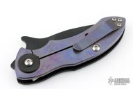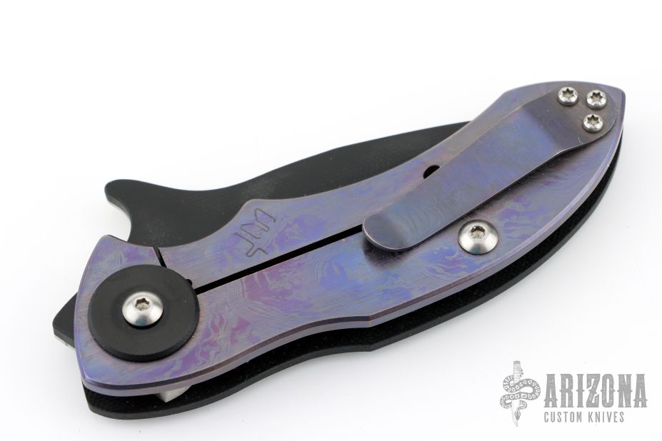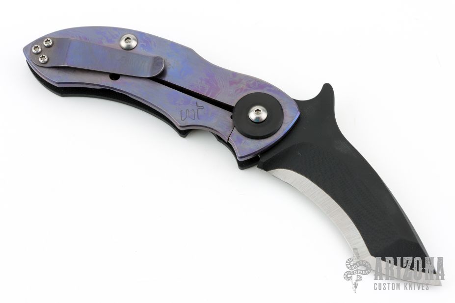 This Sinraptor by Warren Thomas features a chisel ground satin finish blade with a black G10 laminate on one side and thumb ramp. The handle features and anodized lockside, milled black G10 cover, anodized titanium tip up clip. G10 pivot surround and overtravel stop. Comes in a zipper case. Has a couple light scuffs, excellent condition otherwise.