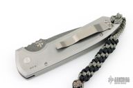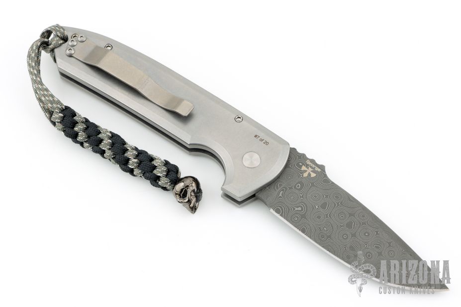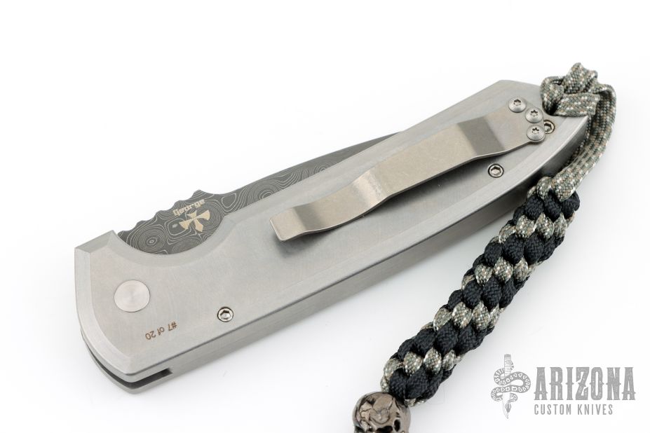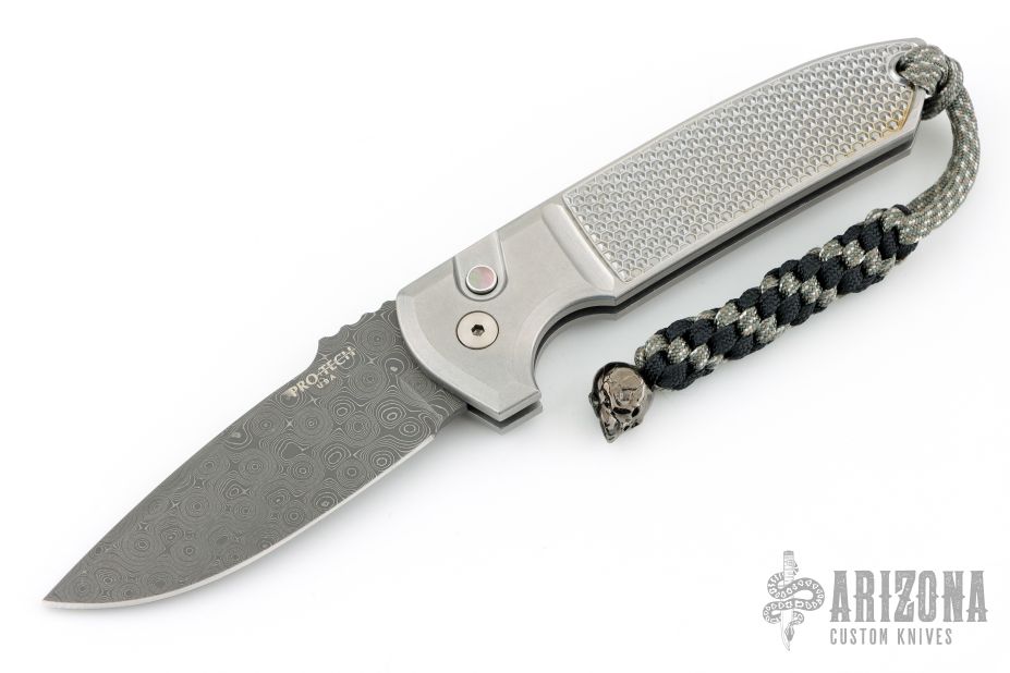 This LG Rockeye Auto by ProTech has a Nichols Raindrop pattern Damascus blade and notched thumbrest. The handle has a milled steel frame with knurling, pearl inlaid button, with matching steel tip up pocket clip. Typical flawless Pro-tech mechanics and blade seating. Comes with original box, PT nylon sheath, and papers. Has a lanyard attached, excellent condition.