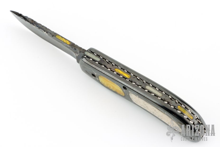 "I began making knives by stock removal using 440C stainless. I sold my first knife in 1976. I became a voting member of the Knifemakers Guild in 1988. Around 1985 I met Hugh Bartrug and we became good friends. I spent a good bit of time in Hugh's shop over the years learning the art of bladesmithing. I joined the American Bladesmith Society in 1988, earning my journeyman's stamp in 1991 and my Mastersmith stamp in 2001. I use many different metals in my Damascus some of which are 0-1, 1084, 1095, 203E, Nickel 200, L-6, 15N20, and powder metal in my mosaic. I make all types of knives using various materials. I prefer using natural handle materials like pearl, ivory, stag, and the exotic hardwoods."