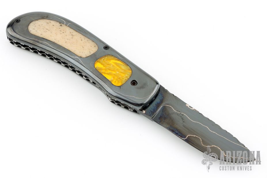 This linerlock folder by Greg Gottschalk features a Damascus blade and matching Damascus frame with amber and oosic inlays on both sides. The blade spine, backspacer, and interior are fileworked and have alternating amber and oosic inlays. Smooth action. Perfect blade seating and lockup. Beautiful materials. A great looking knife with a nice solid, heavy feel. Has a few light scratches, excellent condition. #214 on the blade.