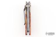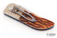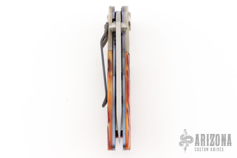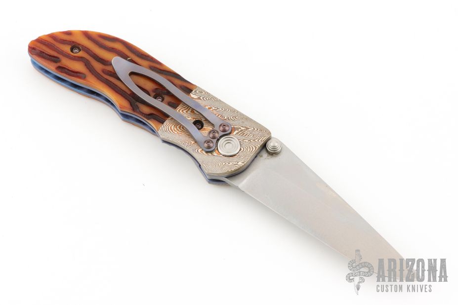This early folder by Allen Elishewitz has a tumble finish blade with dual thumbstuds. The handle has Mokume bolsters, jigged bone scales, anodized titanium liners and tip down clip. Nice lockup, detent, and seating. Excellent condition.