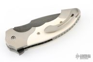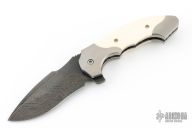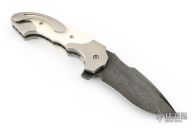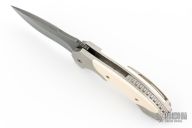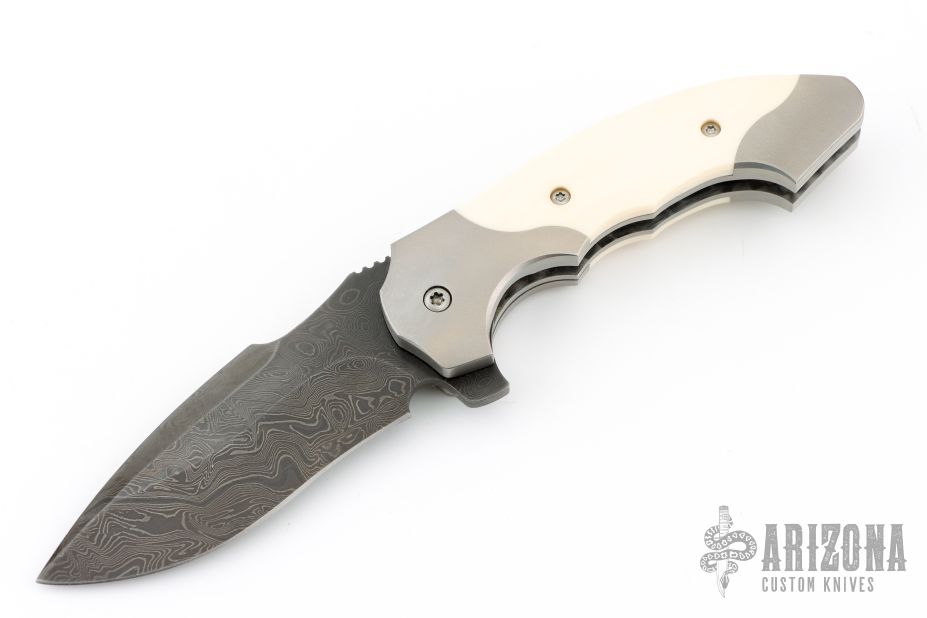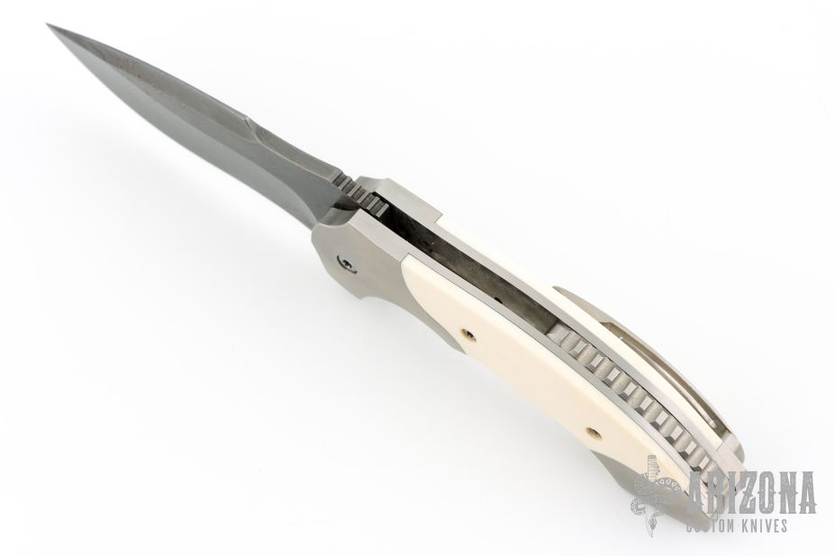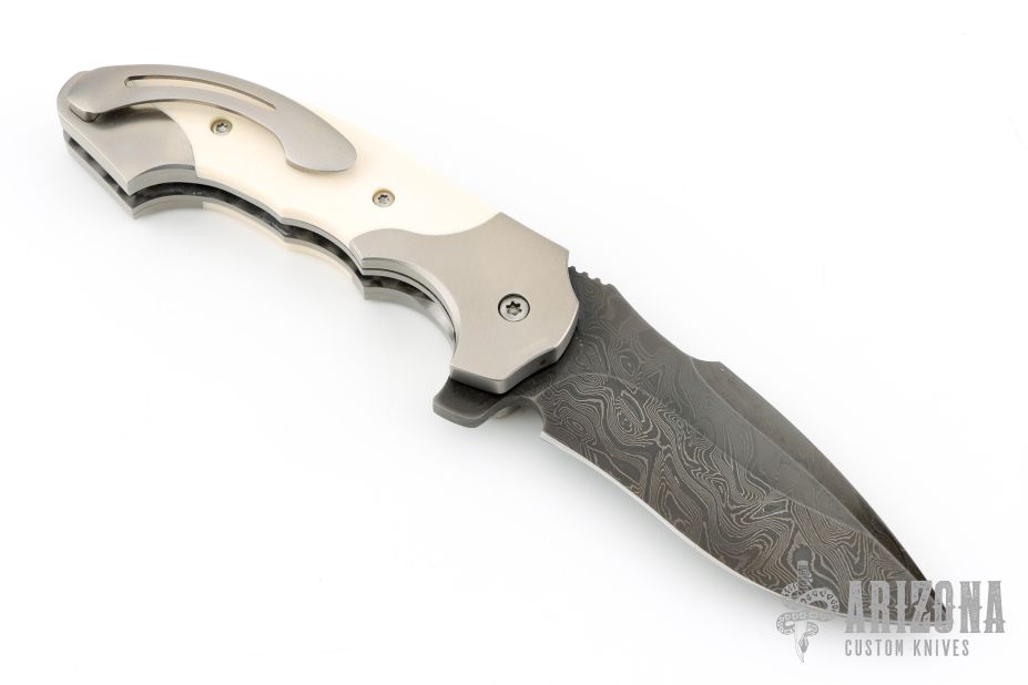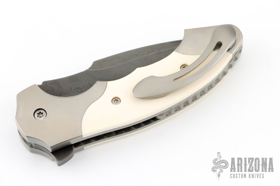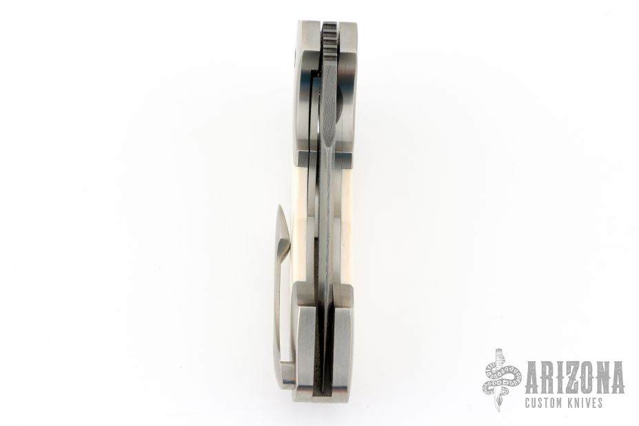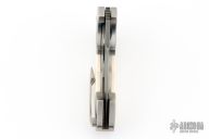 This Mini Archangel from Mr. Fischer features a darkened Damascus blade with false top edge, notched thumbrest and flipper. The handle has orange peel finished titanium bolsters, bone scales, satin finished titanium liners with jeweled interiors, notched titanium backspacer, and an orange peel tip up titanium clip. Nice detent, lockup and blade seating. Rides on a bearing system. Comes with a zipper case. Has some patina on the blade, and a couple light scuffs, excellent condition otherwise.