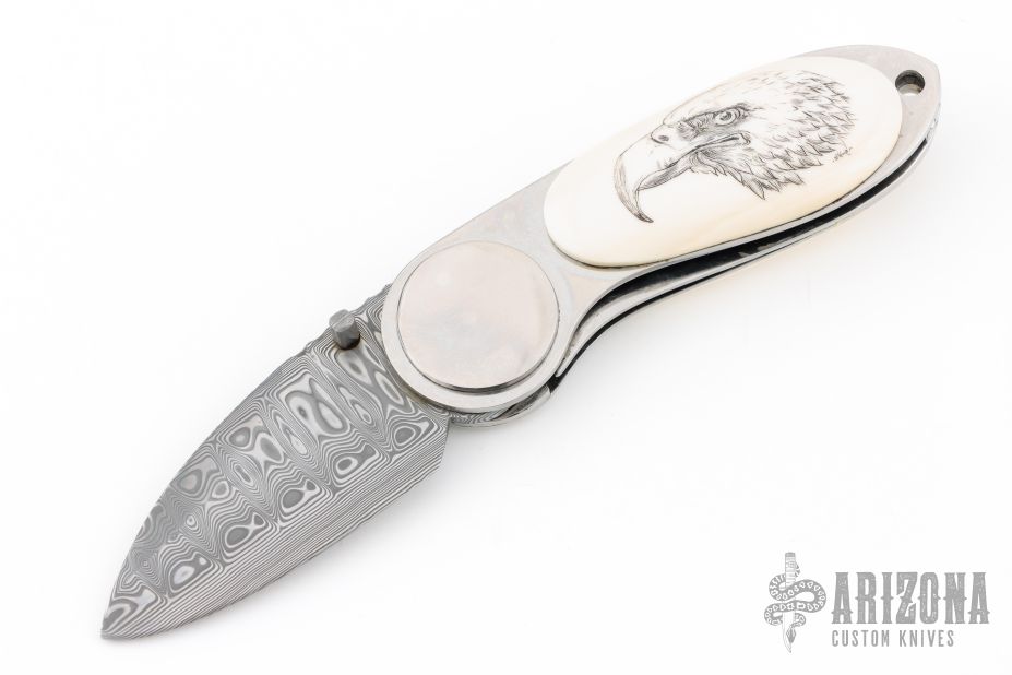 This linerlock features a Damascus blade with notched thumbrest and a Damascus thumbstud. The handle has a stainless steel frame, liner and fileworked backspacer. Has mammoth ivory scales with scrimshaw of an eagle, it is signed, but I can't figure out what it says. Nice detent, lockup and blade seating. Has some light scratches, otherwise good condition. Please let us know if you know who made this.