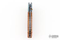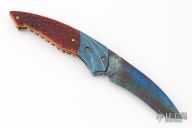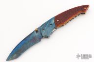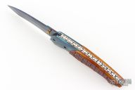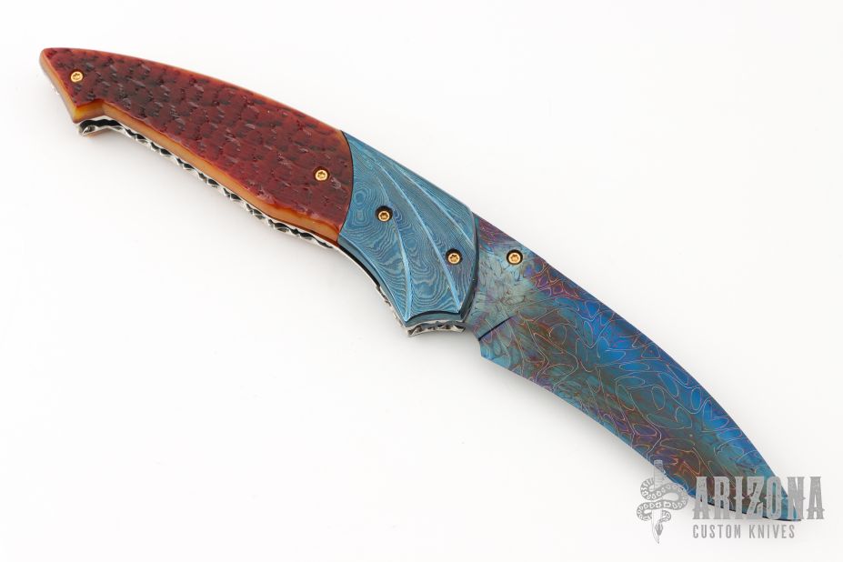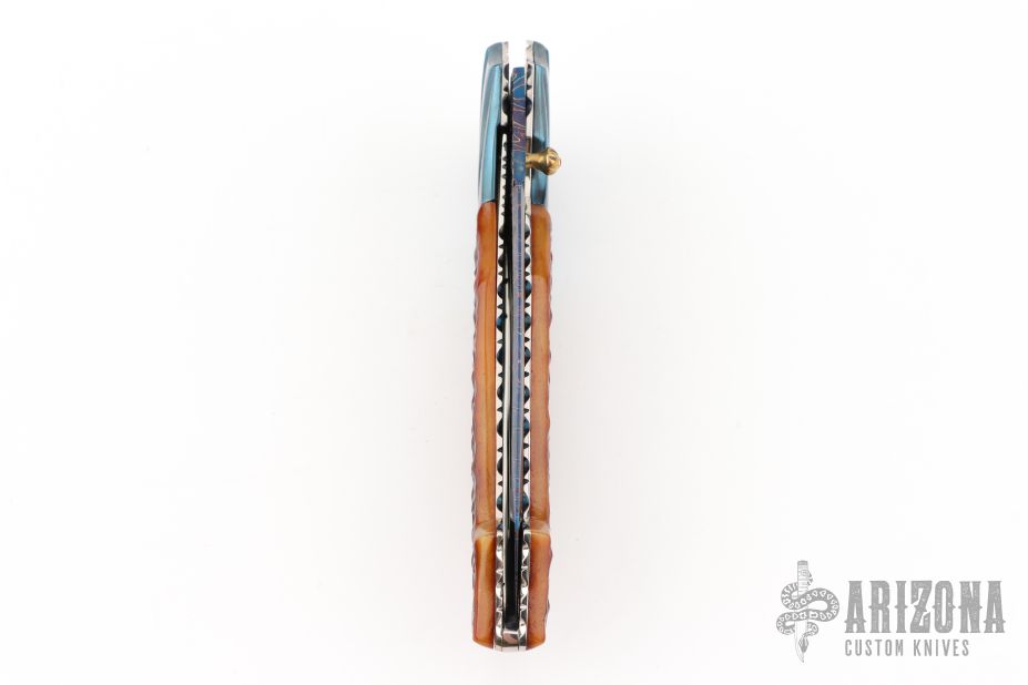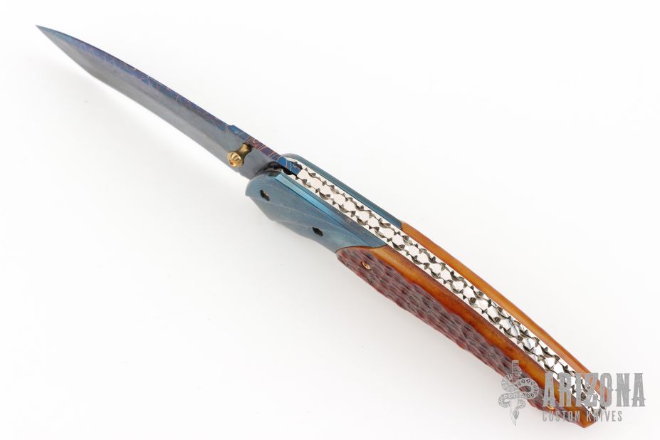 This linerlock features a blued Damascus blade with single thumbstud with orange stone inlay. The handle has carved and blued Damascus bolsters, jigged bone scales with fileworked stainless steel liners and backspacer, gold plated screws. Nice detent, lockup and blade seating. Comes with a leather belt sheath. Excellent condition.