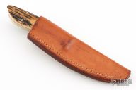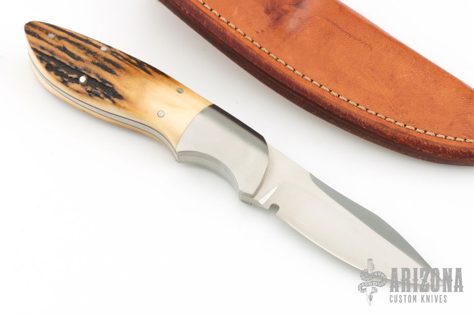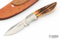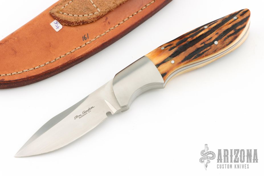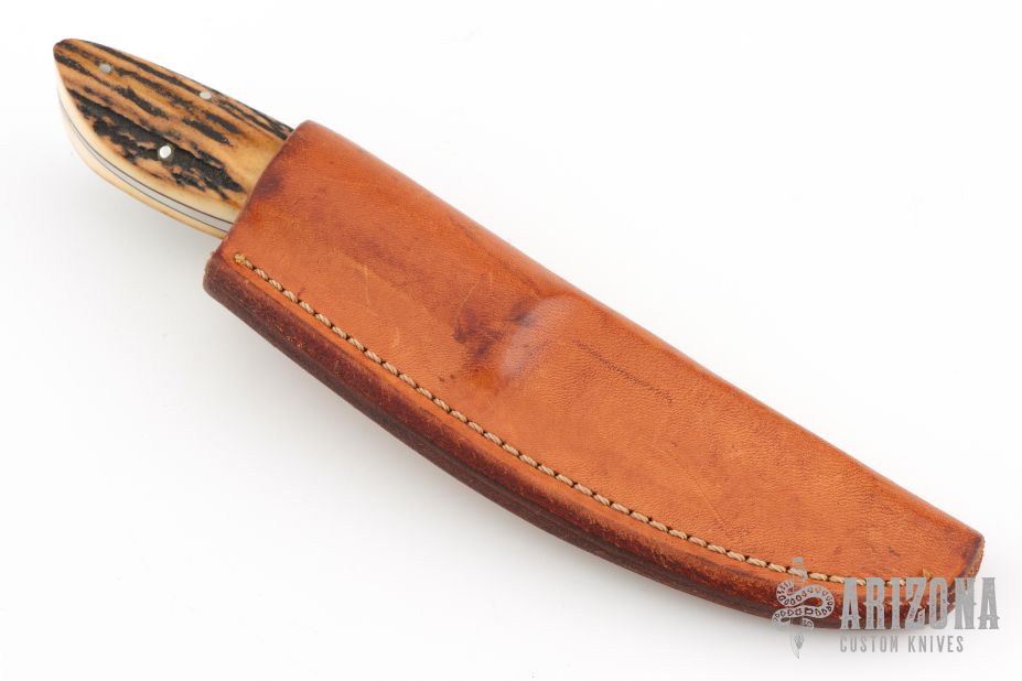 This custom fixed blade by Ron Gaston features a hand rubbed satin finished blade with false top edge and a full tapered tang construction, .161" blade stock and .880" blade depth. The handle has satin finish stainless steel dovetailed bolsters, stag scales with red liners and stainless steel pins. Comes with a brown leather sheath. Has a couple light scratches, otherwise excellent condition.