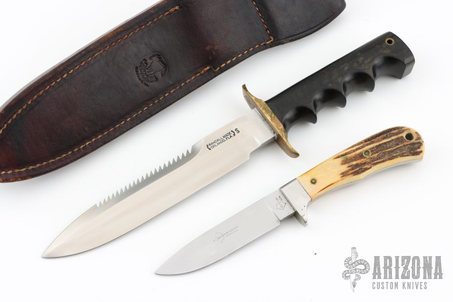 The Model 16-7 Diver or Special Fighter by Randall Made Knives was designed especially for heavy-duty salt water use and is as nearly indestructible as possible. This knife has a stainless steel blade with sawteeth, .224" blade stock and 1.216" blade depth, full tang construction. The handle has a brass guard, black linen micarta finger groove handle with a lanyard hole. Comes with a custom brown leather sheath by Jackass Leather in Glenview Illinois that also holds a Bowen USA Hunter. Has a few light scratches and some patina on the guard, otherwise excellent condition.