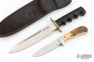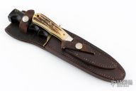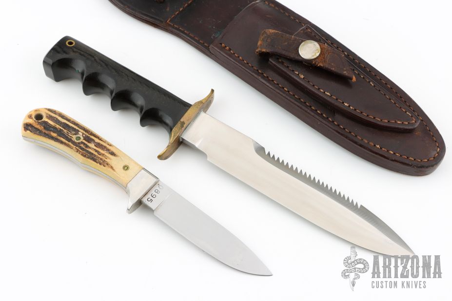 The knife by Bowen USA features a satin finished drop point blade, .167" blade stock and .847" blade depth, full tang construction. The handle has a stainless steel guard and stag scales. Has some scratches, otherwise good condition. #0895 on blade. 4" blade and 8" overall.