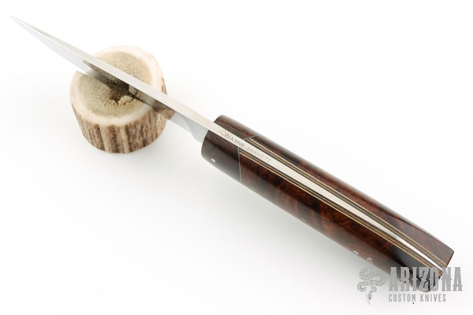 From a 2011 A.G. Russell Knife Maker Spotlight : Colorado knifemaker, Wayne Jarrett, found his love for knives when he received his first pocketknife from his dad for his 7th birthday and a stacked leather hunting knife from his brother-in-law one Christmas several years later. That was all it took and Wayne has been hooked ever since. Wayne made his first knife in 1995. He was a part-time maker until early 2009 when he decided to start making knives full-time.
