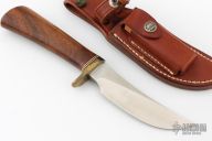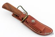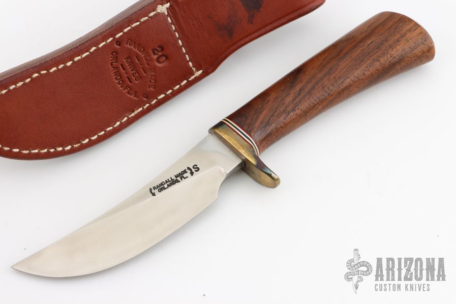 This Model 20 from Randall features a satin finished upswept stainless steel blade with notched thumbrest, .229" blade stock and 1.124" blade depth, hidden tang construction. The handle has a brass guard, and a walnut grip with red/white/blue spacers. Comes with brown leather sheath. Has some patina on the guard, otherwise excellent condition.