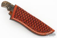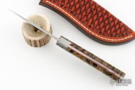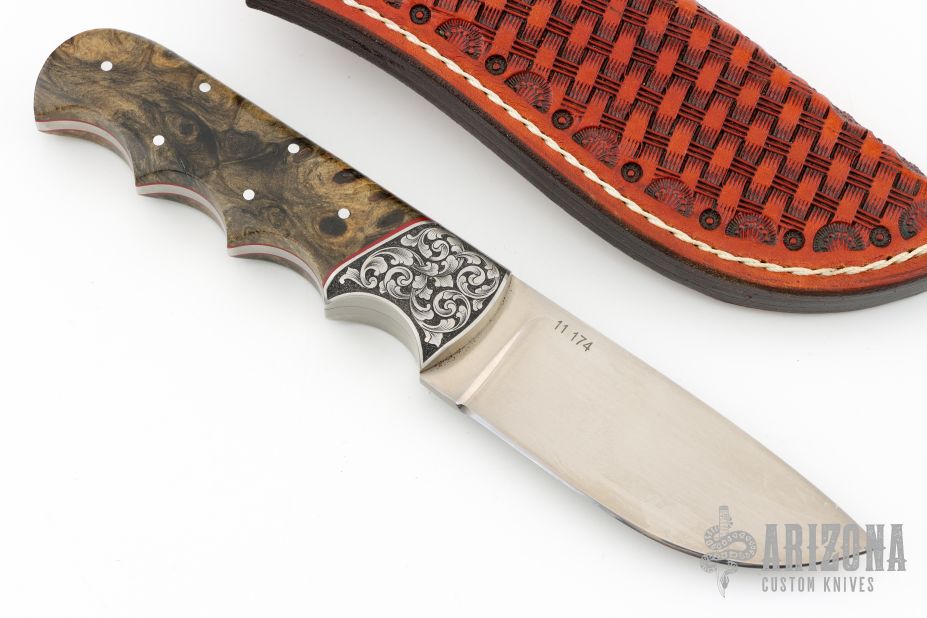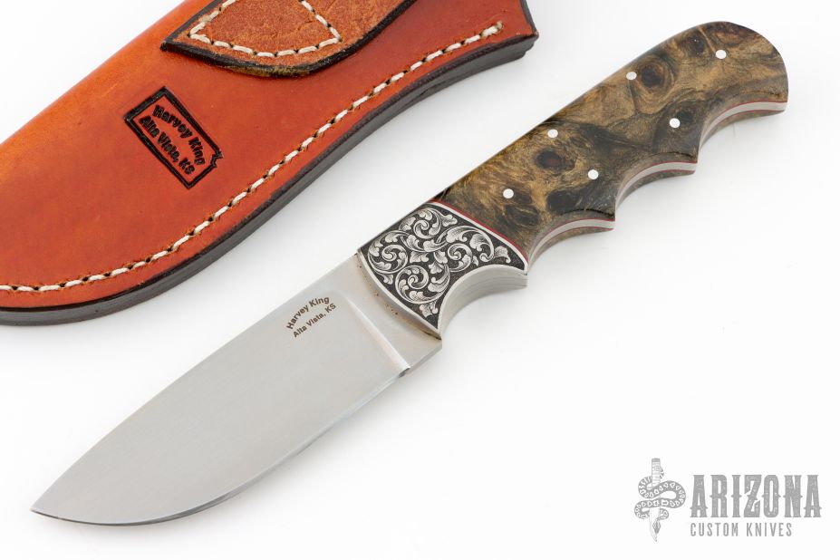 This knife by Harvey King features a hand satin finished blade with .133" blade stock and 1.2" blade depth, full tang construction. The handle has stainless dovetail bolsters engraved by Russ Zima, red liners, and pinned California buckeye burl covers with finger grooves. Includes a hand-tooled brown leather sheath and COA dated 11-18-2011. Has a couple light scuffs, otherwise Excellent Condition.