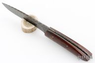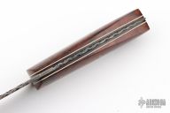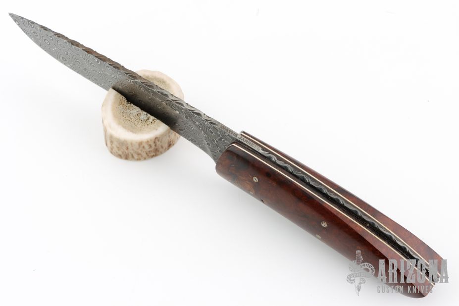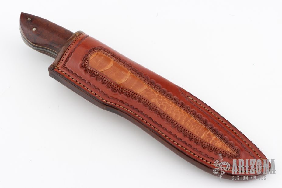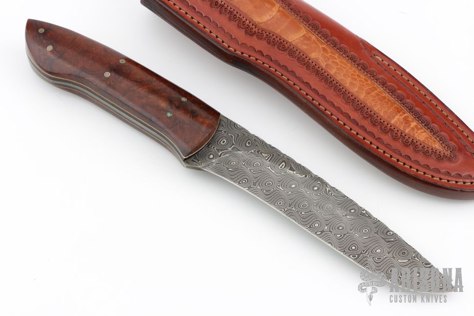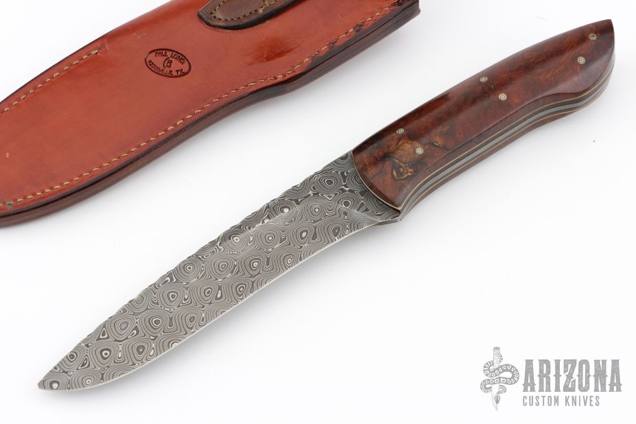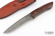 This Drop Point Hunter by Wayne Jarrett features a Damascus drop point blade with a full tang construction with file work along the  blade spine, .125" Blade Stock and 1.406" Blade Depth. The handle features mosaic pinned desert ironwood covers with white liners. Includes a very nice Paul Long brown leather belt sheath. Light patina is visible on the blade and pins. Excellent condition otherwise.