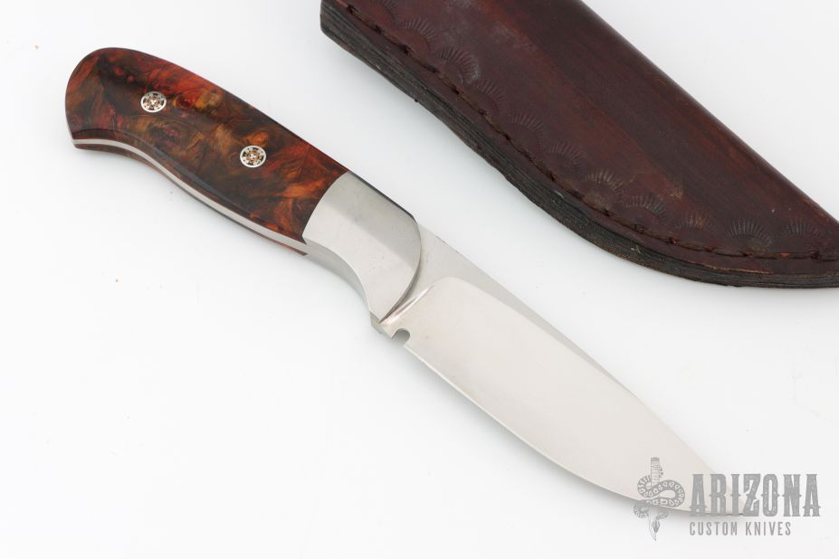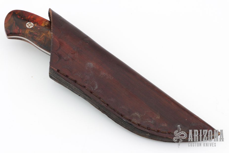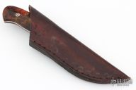 This Hunter by Ron Gaston features a hand rubbed satin finish blade with .150" black stock and 1.12" blade depth, full tapered tang construction. The handle has dovetailed stainless steel bolsters, burl wood scales with mosaic pins and red liners. Comes with a brown leather sheath. Has a few light scratches otherwise the knife is in excellent condition.