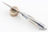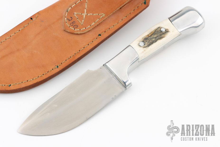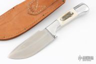 This Skinner by Rudy Ruana features a satin finished blade with false top edge and notched thumbrest, .176" blade stock and 1.675" blade depth, hidden tang construction. The handle is cast aluminum with elk antler inserts. Comes with original brown leather sheath. Has some light scratches, otherwise excellent condition.