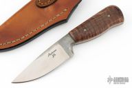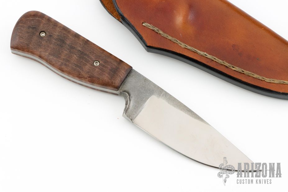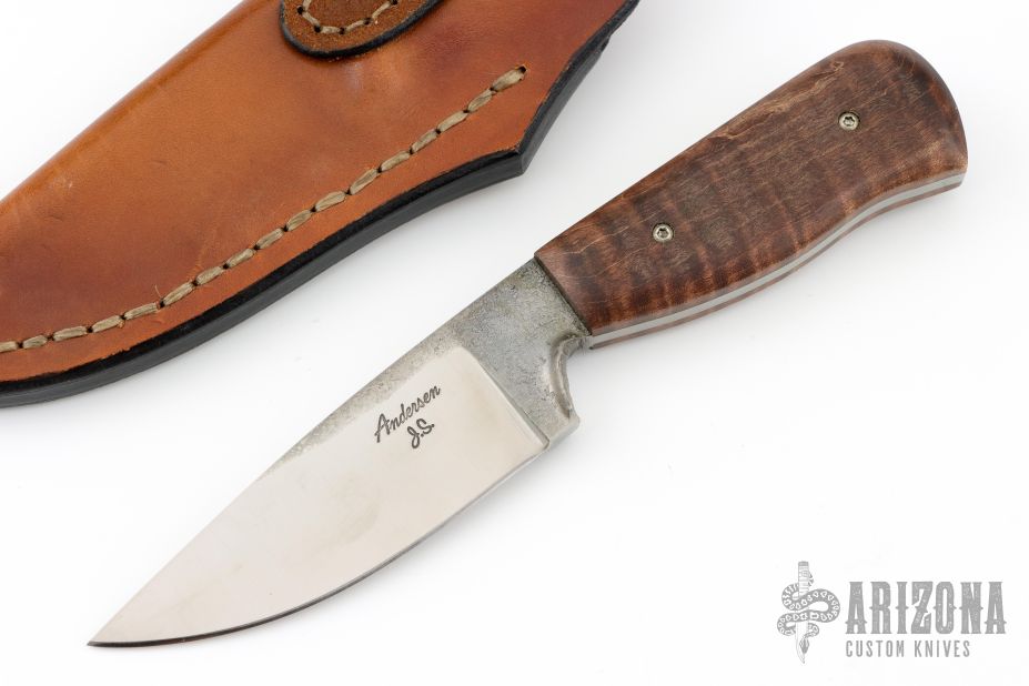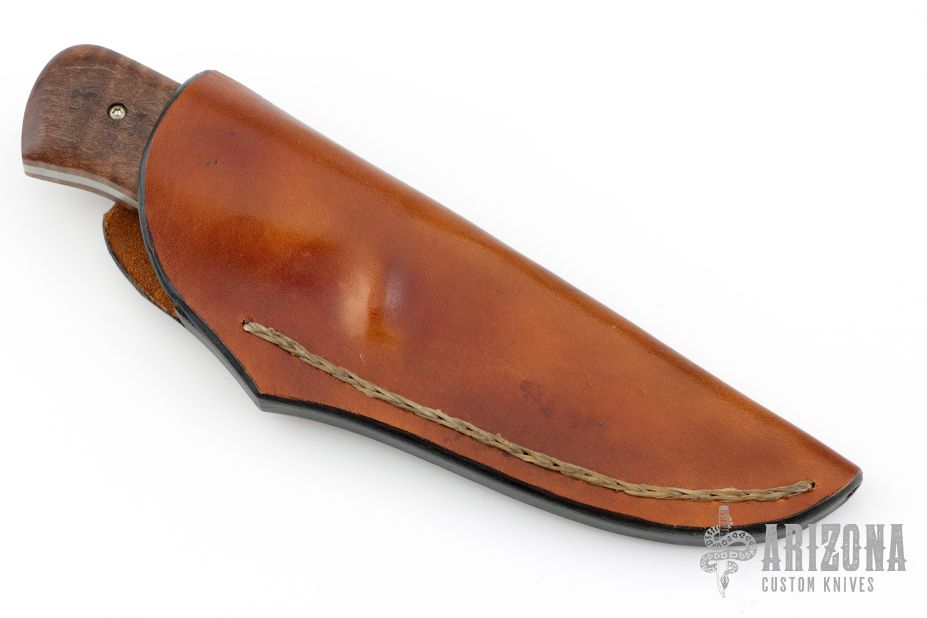 This Brute De Forge Hunter by Journeyman Smith Karl Andersen features a satin finished blade with forge finished flats and forged flanged guard, .256" blade stock and 1.364" blade depth, full tang construction. The handle has wood scales. Comes with a brown leather sheath. Has a couple extremely light scratches, otherwise excellent condition.