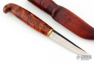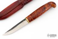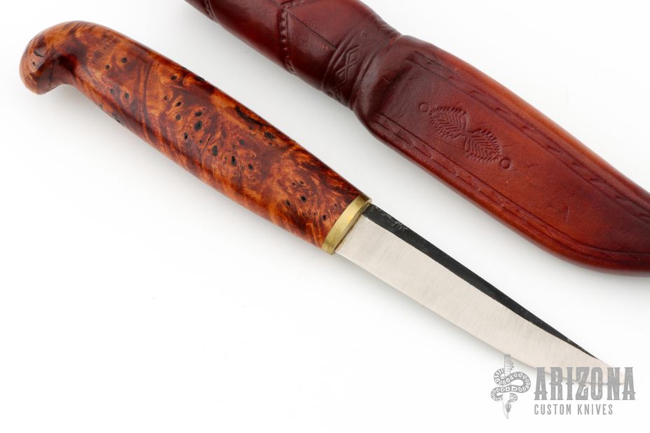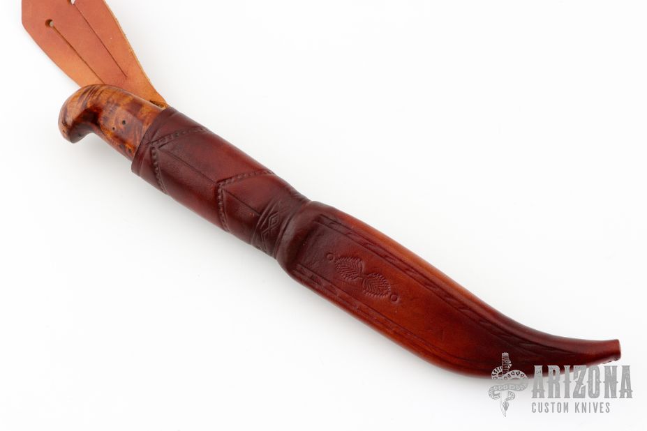 This knife by Kellam Knives features a hand forged drop point blade. .197" Blade Depth .769" Blade Depth. The handle features a brass guard complemented by a wood grip. This knife features a hidden tang construction. Includes a brown leather sheath. Light scuffs are visible on the handle and blade otherwise the knife is in excellent condition.