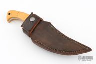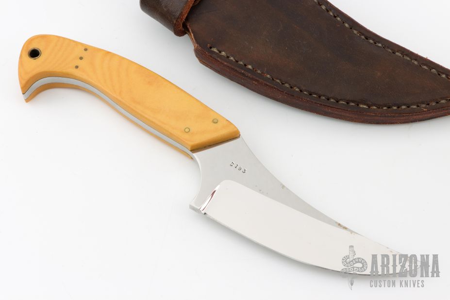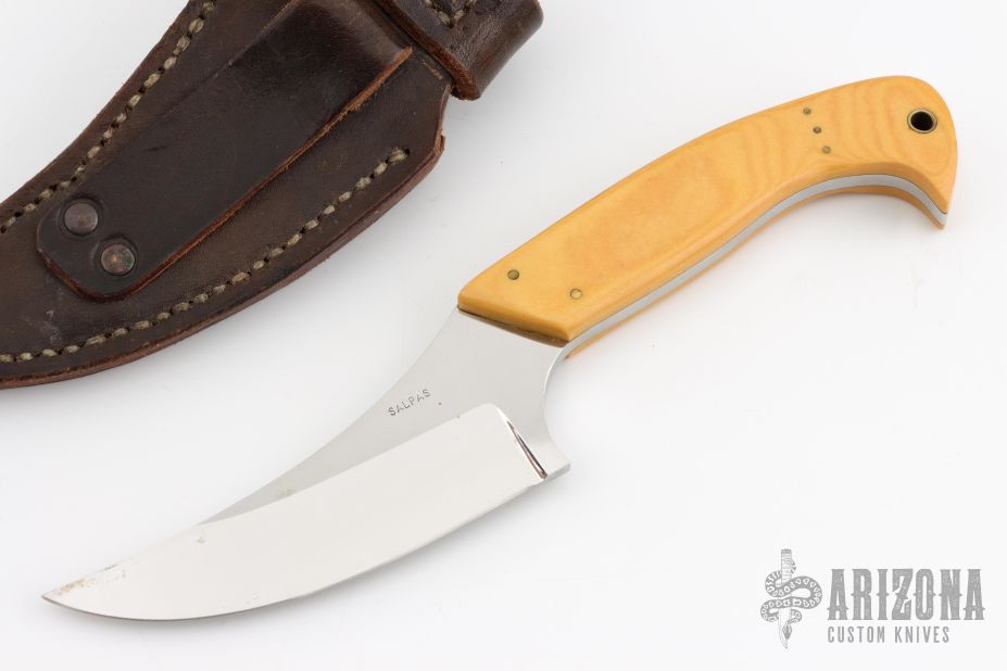 This Skinner by Bob Salpas has a mirror polished blade with full tang, .186" blade stock, 1.796" depth. Handle has yellow paper micarta scales with brass pins and lanyard hole. Comes with brown leather sheath. Has some light scratches and oxidation spots, otherwise good condition. C193