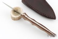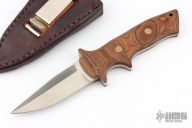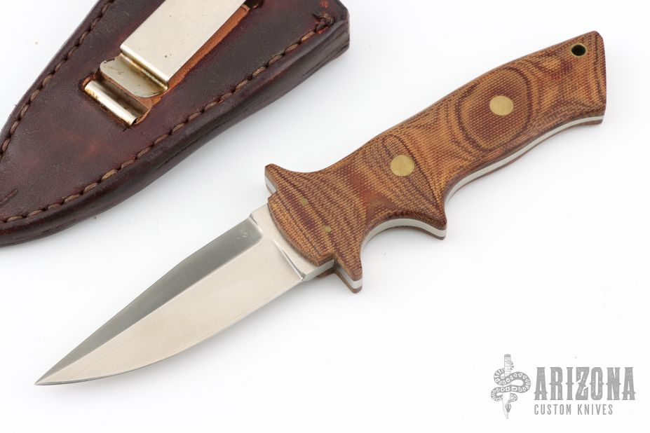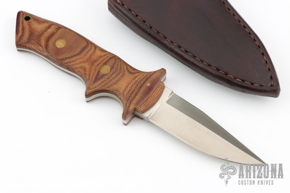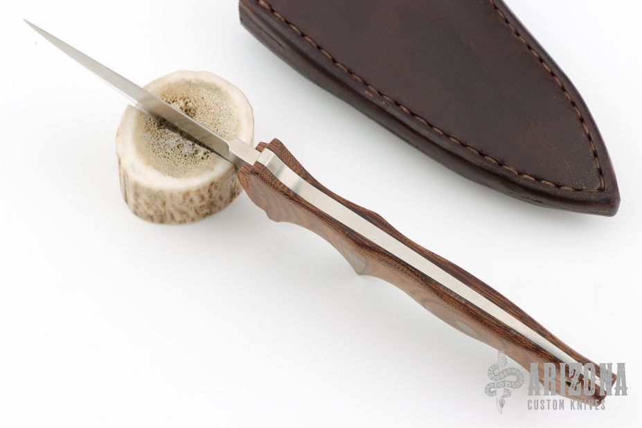 This Sub-Hilt Fighter by Jim Turecek features a satin finished blade with false top edge, .194" blade stock and 1.157" blade depth, full tapered tang construction. The handle has brown canvas micarta scales, brass pins and a lanyard hole. Comes with a brown leather sheath with boot clip. Excellent condition. #02 under the ricasso