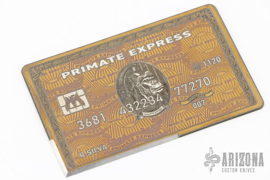 Primate Express Titanium Card Blade by Mummert Knives. Has Fiber Laser Color and Deep Etch. Tungsten carbide edge, RC 72. New Condition.
