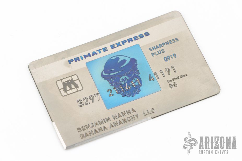Primate Express Titanium Card Blade by Mummert Knives. Has Fiber Laser Color and Deep Etch. Tungsten carbide edge, RC 72. New Condition.