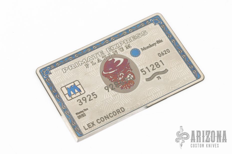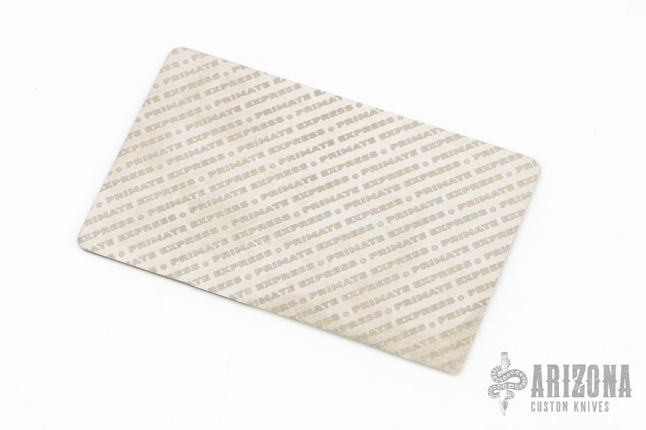Primate Express Titanium Card Blade by Mummert Knives. Has Fiber Laser Color and Deep Etch. Tungsten carbide edge, RC 72. New Condition.
