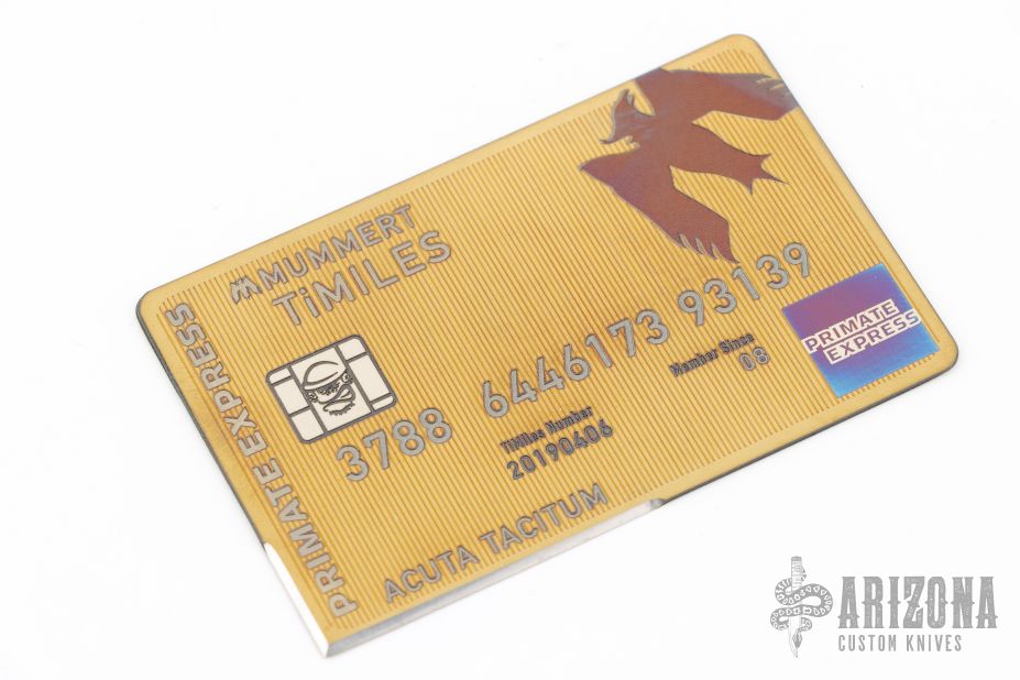 Primate Express Titanium Card Blade by Mummert Knives. Has Fiber Laser Color and Deep Etch. Tungsten carbide edge, RC 72. New Condition.