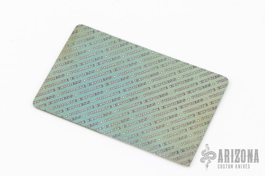 Primate Express Titanium Card Blade by Mummert Knives. Has Fiber Laser Color and Deep Etch. Tungsten carbide edge, RC 72. New Condition.