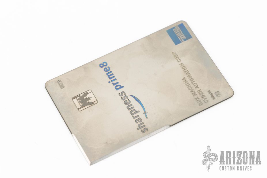 Primate Express Titanium Card Blade by Mummert Knives. Has Fiber Laser Color and Deep Etch. Tungsten carbide edge, RC 72. New Condition.
