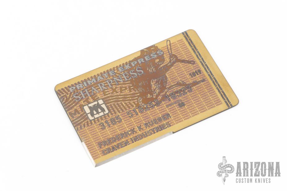 Primate Express Titanium Card Blade by Mummert Knives. Has Fiber Laser Color and Deep Etch. Tungsten carbide edge, RC 72. New Condition.