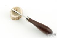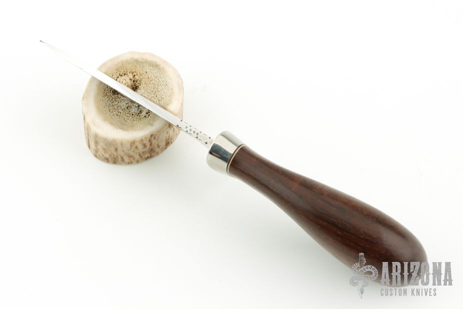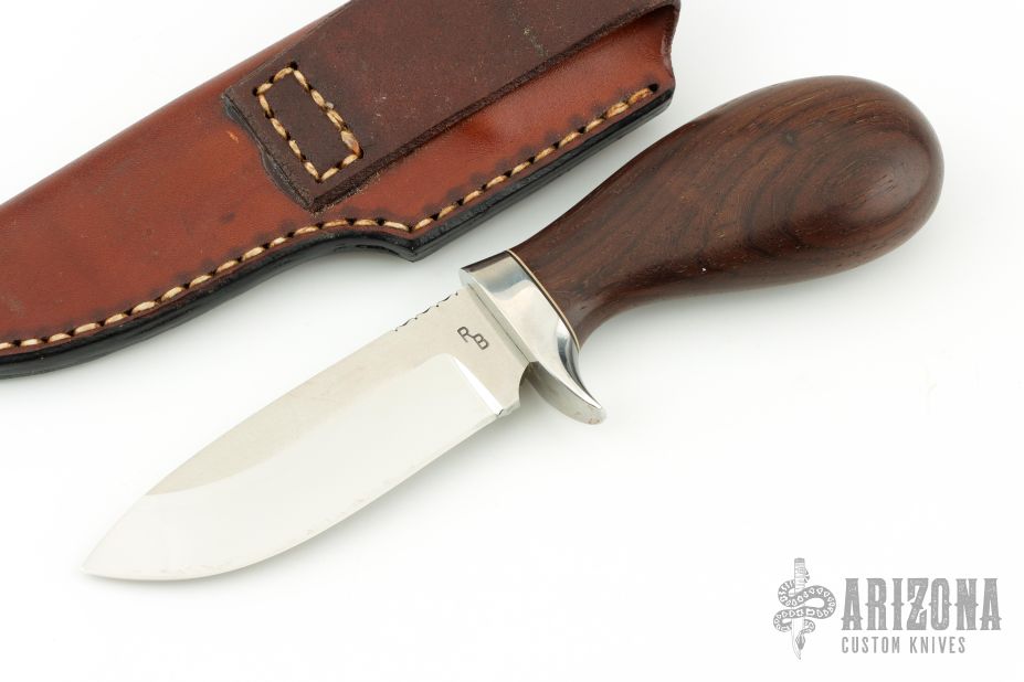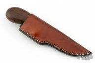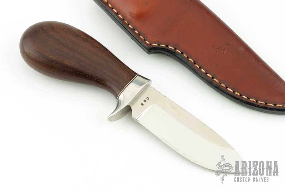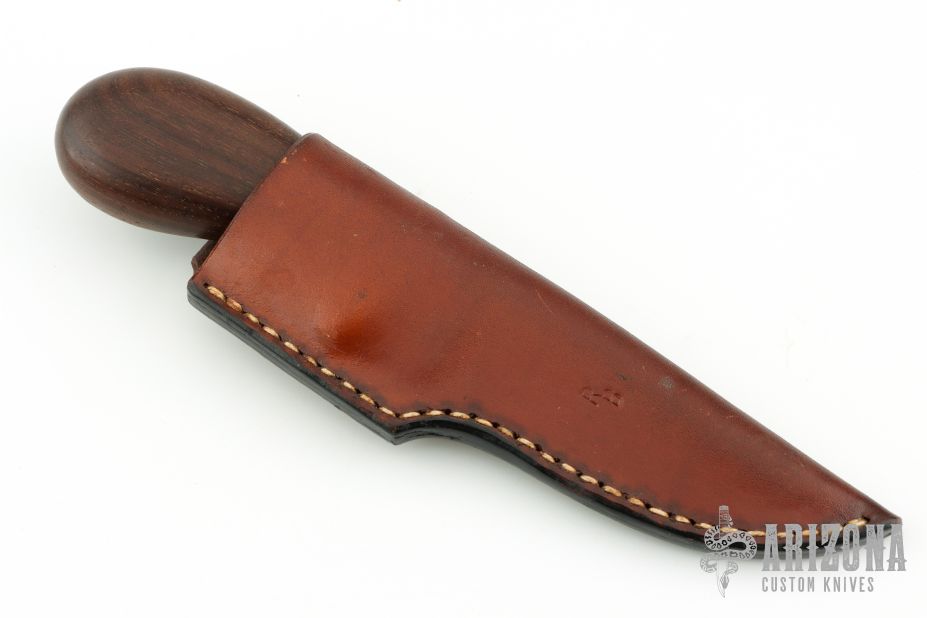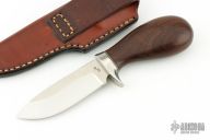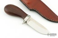 This knife by Ray Beers features a two-tone drop point blade, with a file worked blade spine and hidden tang construction.  .144" Blade Stock.  1.174" Blade Depth.  The handle has an aluminum guard with a wood grip.  Includes a brown leather sheath.  Excellent Condition.