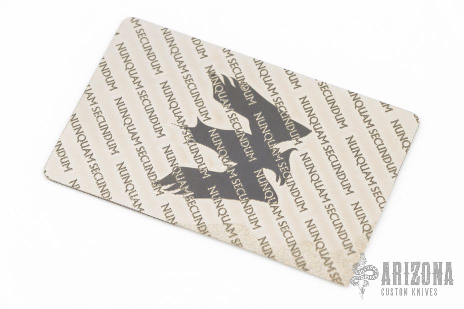 The "Nunquam Secundum" CC-L is a titanium cutting card in collaboration with Bob Terzuola. Unlike some other credit card tools, the CC-L is built for a singular purpose - to give you a razor sharp edge that you can always have with you. It is constructed from .027" thick 6Al-4V titanium with a deeply impregnated carbide layer with a Rockwell Hardness of 72. The perfect back up blade for any situation.