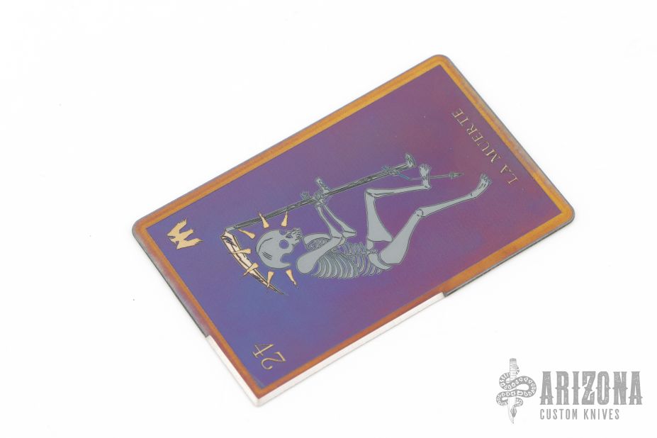 The "La Muerte" CC-L is a titanium credit card knife, with a razor sharp carbidized edge in a purple color finish. Unlike some other credit card tools, the CC-L is built for a singular purpose - to give you a razor sharp edge that you can always have with you. It is constructed from .028" thick 6Al-4V titanium with deeply impregnated carbides at a Rockwell Hardness of 72 provide a long lasting, razor sharp cutting edge. The perfect back up blade for any situation.
