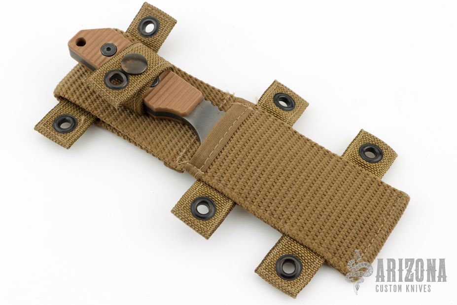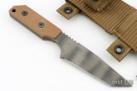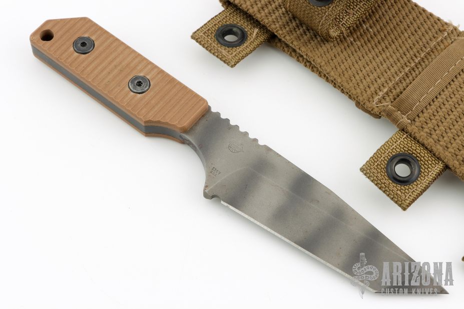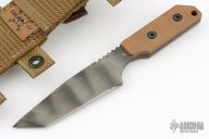 This DB-L from Strider Knives features a clip point tanto style blade with bead blasted tiger stripe finish and notched thumbrest, .252" blade stock and 1.305" blade depth, full tang construction. The handle is comprised of coyote brown G-10 scales. Includes a nylon sheath. Has some scuffs and oxidation spots, otherwise good condition.