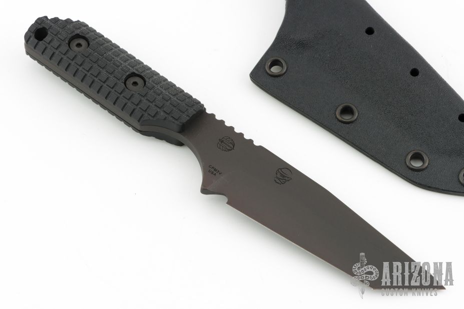 This Mick Strider DBL has a black tanto blade with notched thumbrest, .188" blade stock and a blade height of 1.303". The handle is comprised of black G-10 scales with MEFP, lanyard hole in pommel. Includes kydex sheath. Excellent condition.
