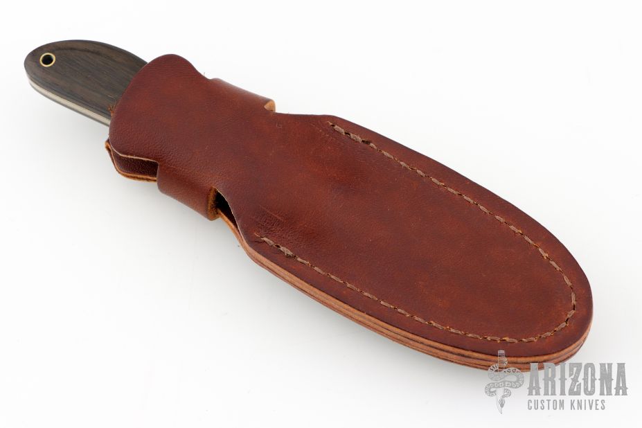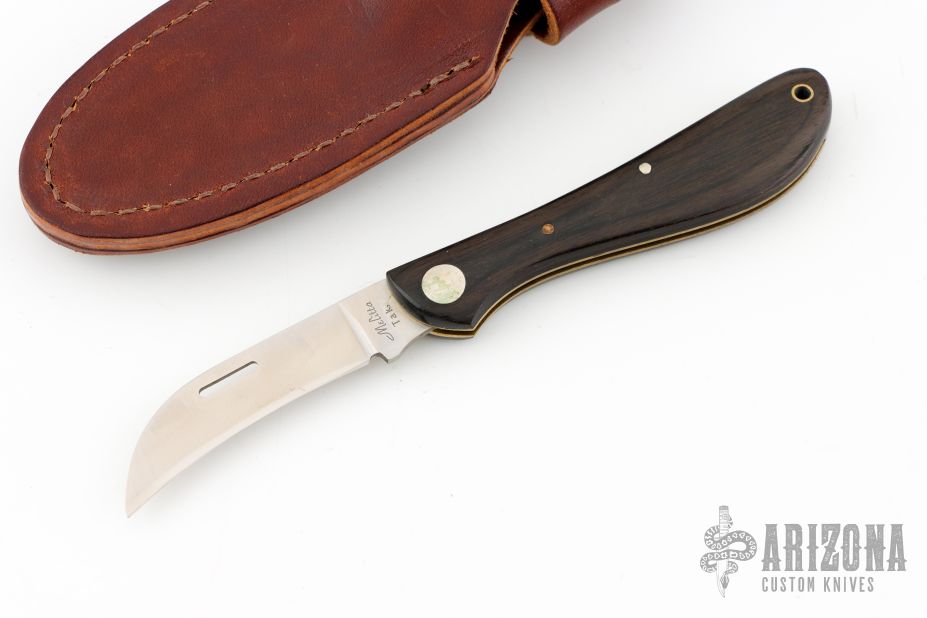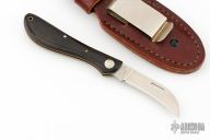 This slipjoint features a satin/polished blade with nail nick. Has nickel silver pivot, wood covers with brass liners and a stainless steel spring. Has half-stop and a nice strong pull. Comes with a leather belt sheath. Has a couple light scratches, excellent condition otherwise.