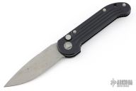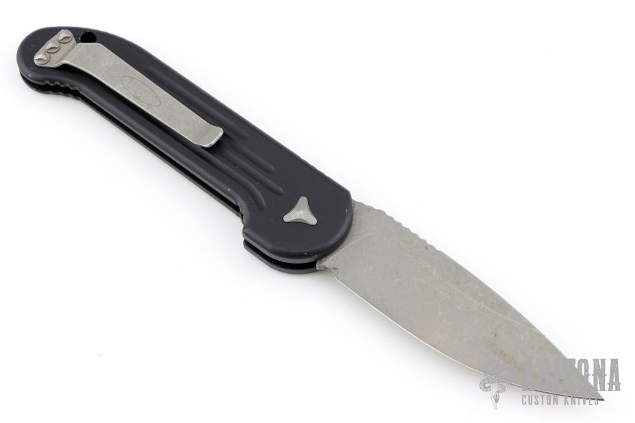 This LUDT side opening automatic by Microtech has an Apocalyptic finished blade with a standard edge and a contoured grey/navy blue aluminum frame. Stainless steel clip. Dated 11/2020 and serial number 20097. Comes with original box and papers. Has scuffs and scratches throughout. Good user condition; fair condition otherwise. Could use some TLC.